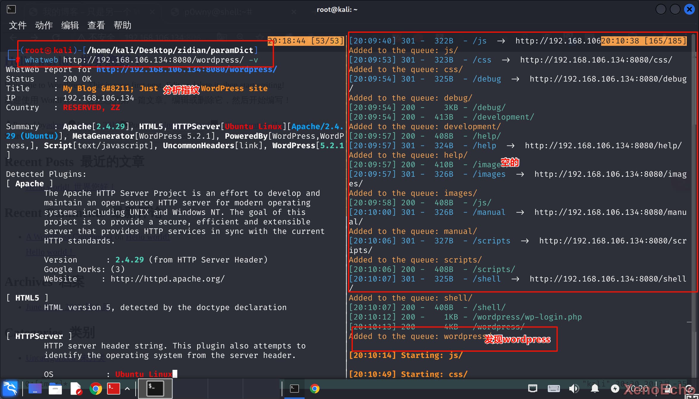 - 打开为默认的apache页面,尝试进行目录爆破,前面一堆空的路径和一个wordpress路径,获取站点指纹确定版本为