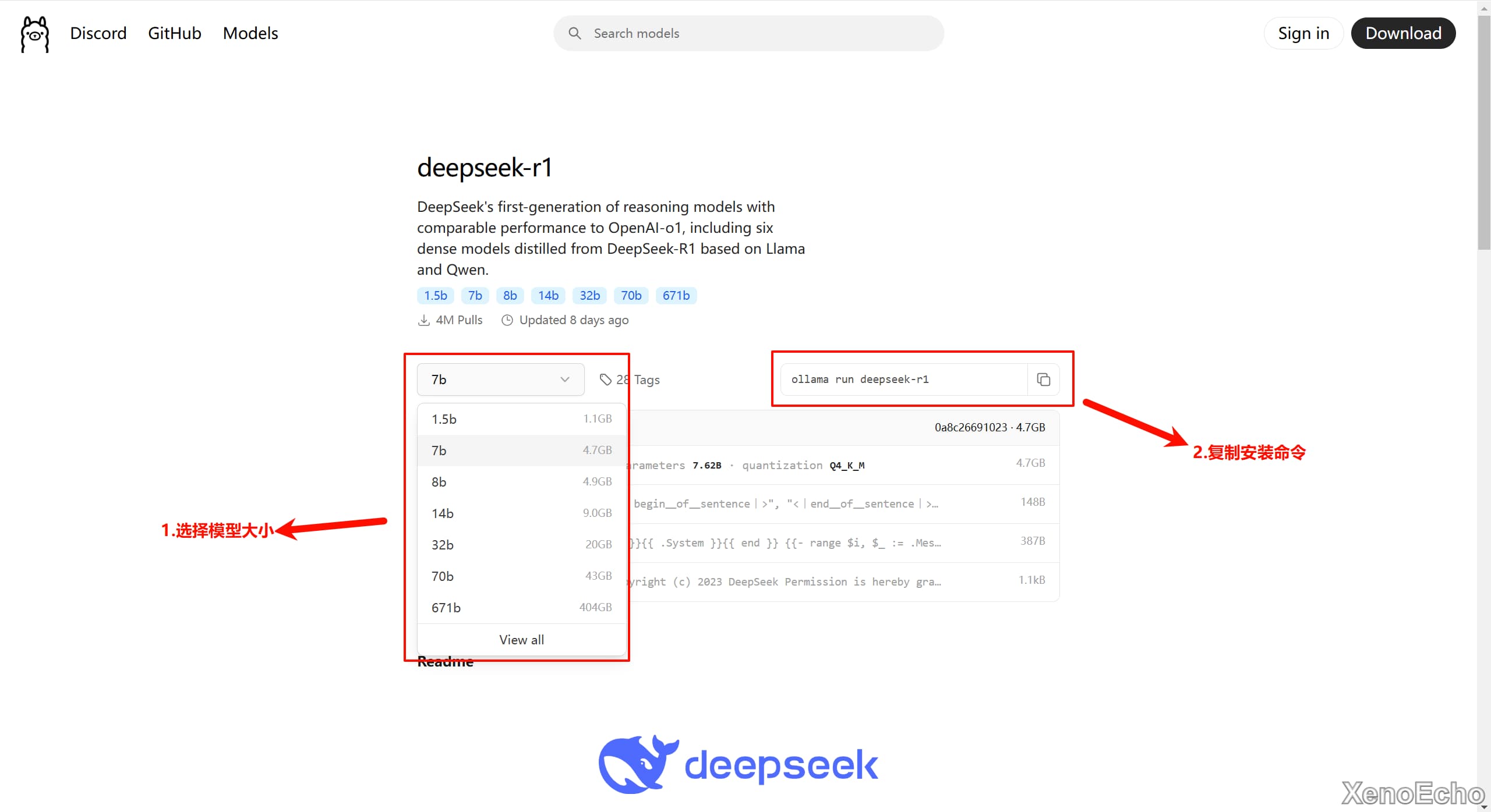 - 选择模型大小。正常情况下根据自己的显卡显存选择,比如显存8G就选择8B的模型