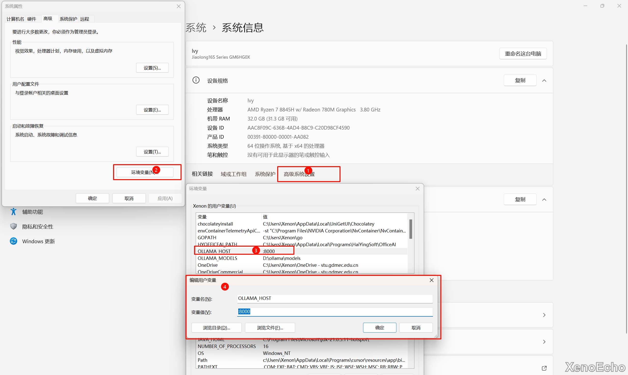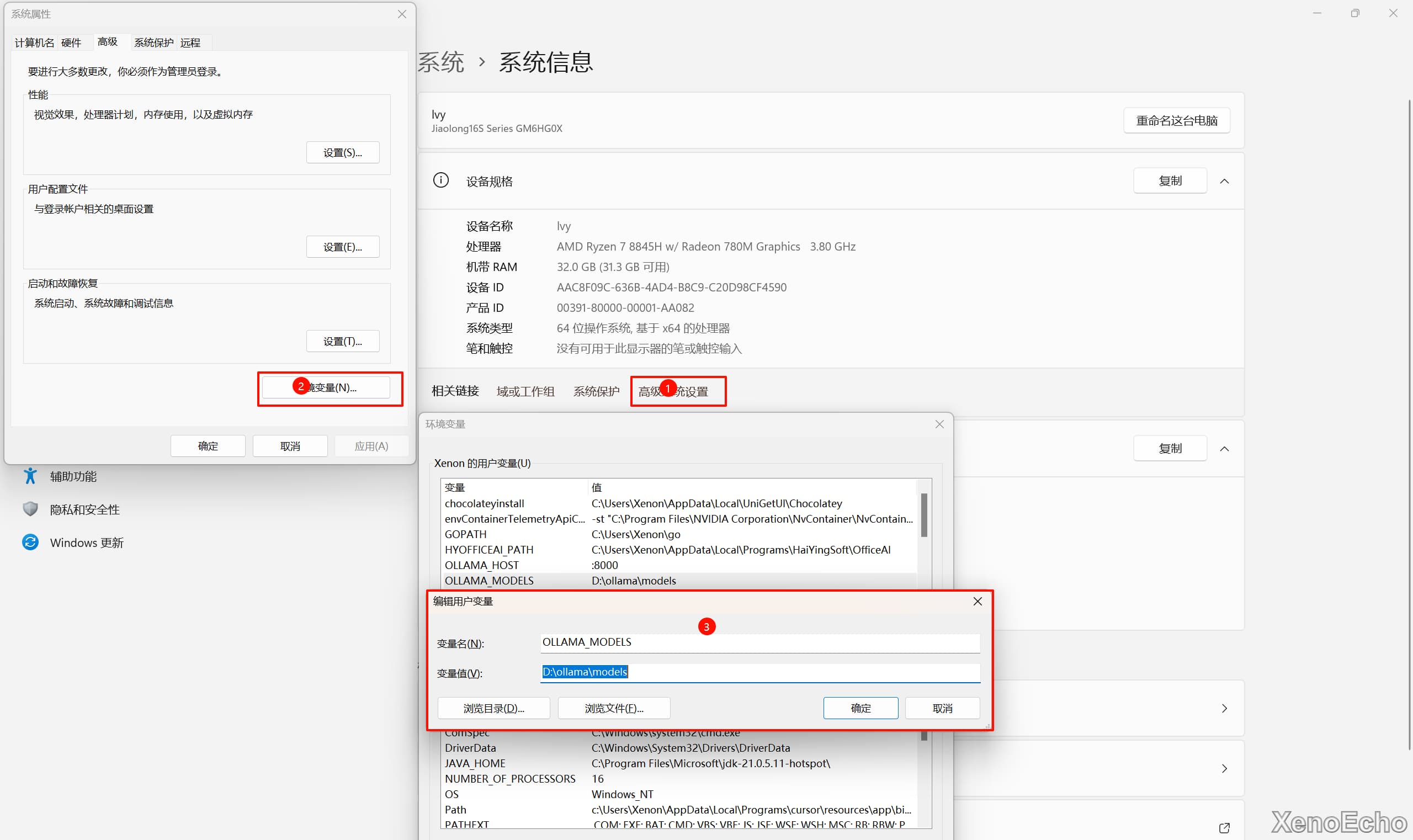 C盘的C:\Users\用户名\.ollama\models下。 - 打开设置的高级系统设置,设置一个新环境变量名字