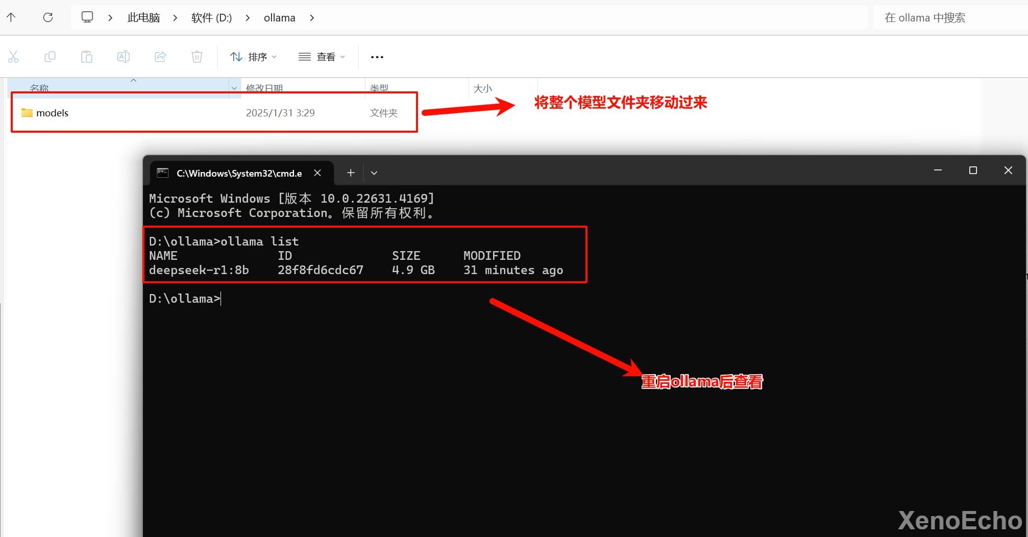 models文件夹移动到新目录下。后即可。注意!这样卸载ollama后是不会删除模型文件的。