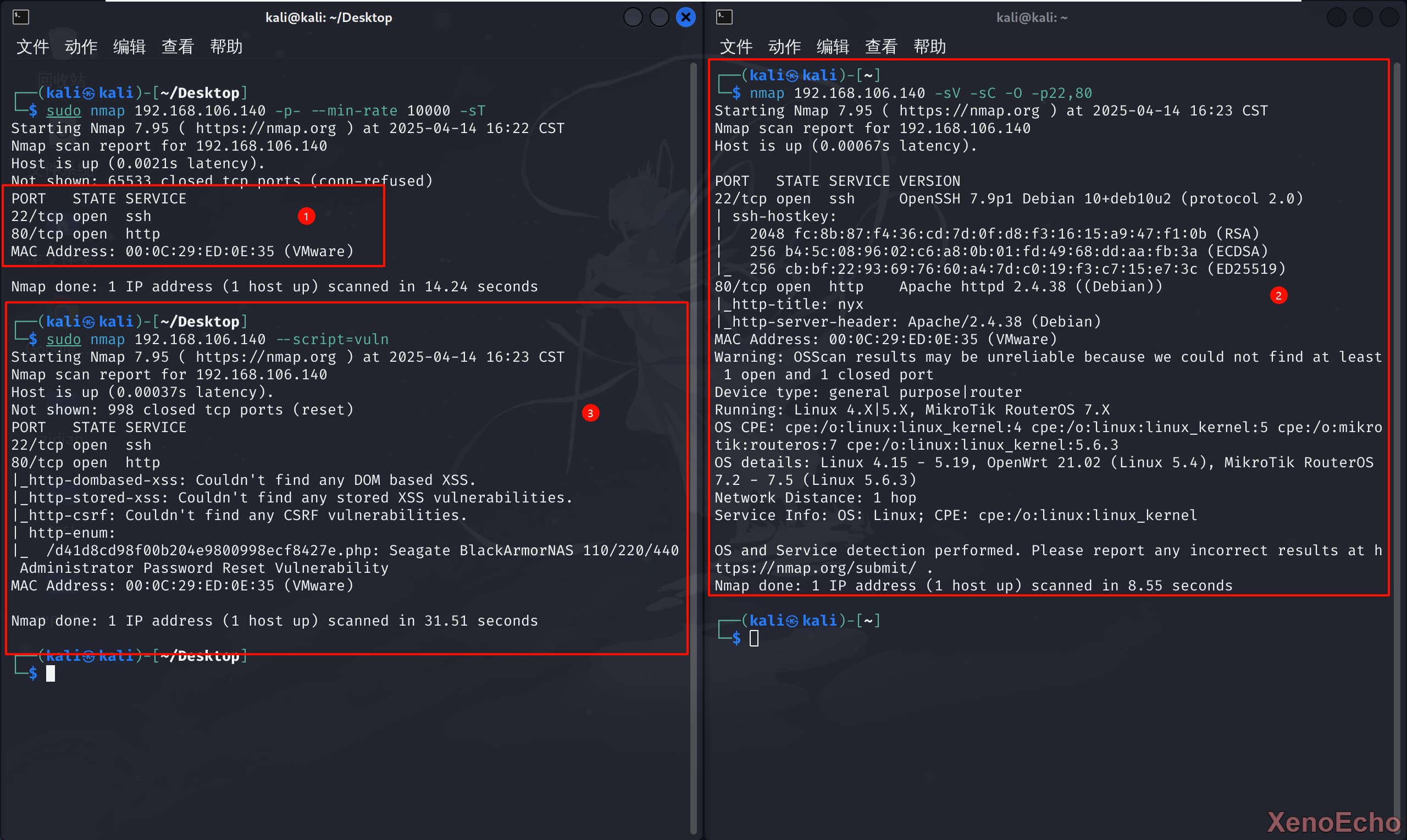 先初步确定开启的端口,然后针对端口确认版本服务信息,nmap漏扫脚本慢可以挂着先。