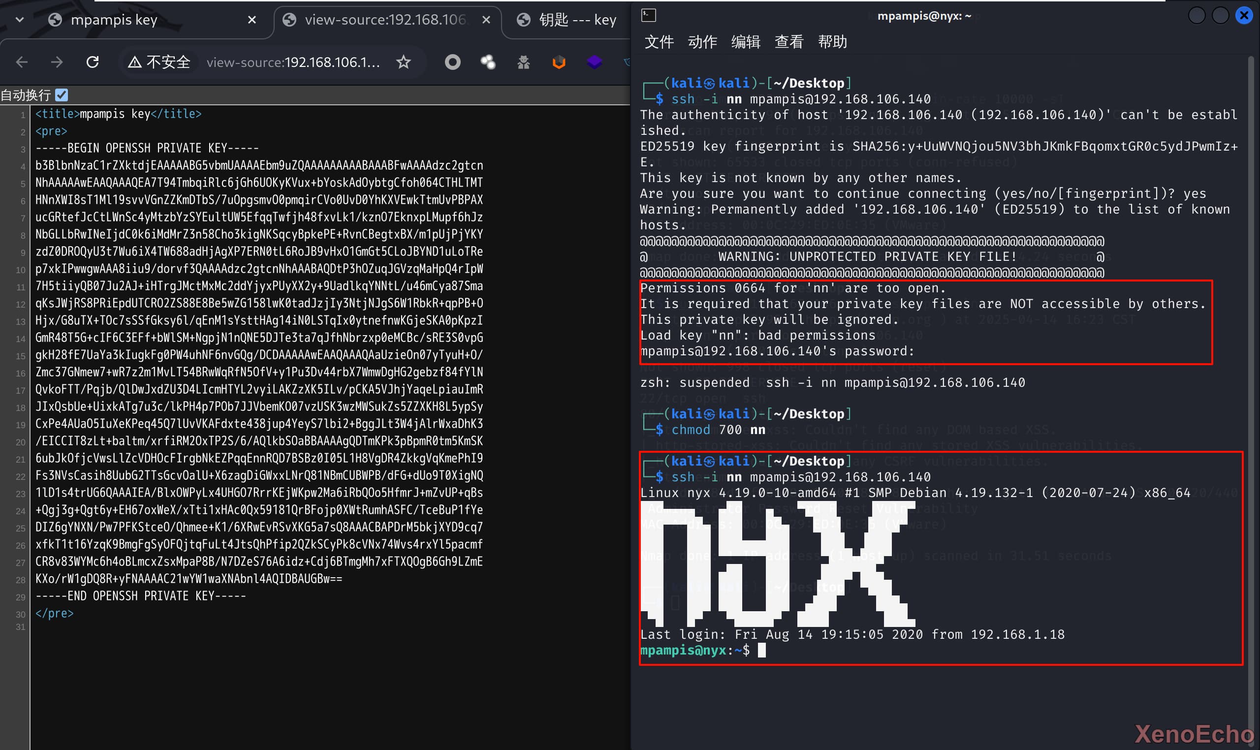 尝试去登录,提示报错了,还是要输入密码?注意看回显的报错,文件权限存在问题,太过于开放了,要限制当前用户具有权限。chmod设置只有自己具有权限后就能登录进去了。