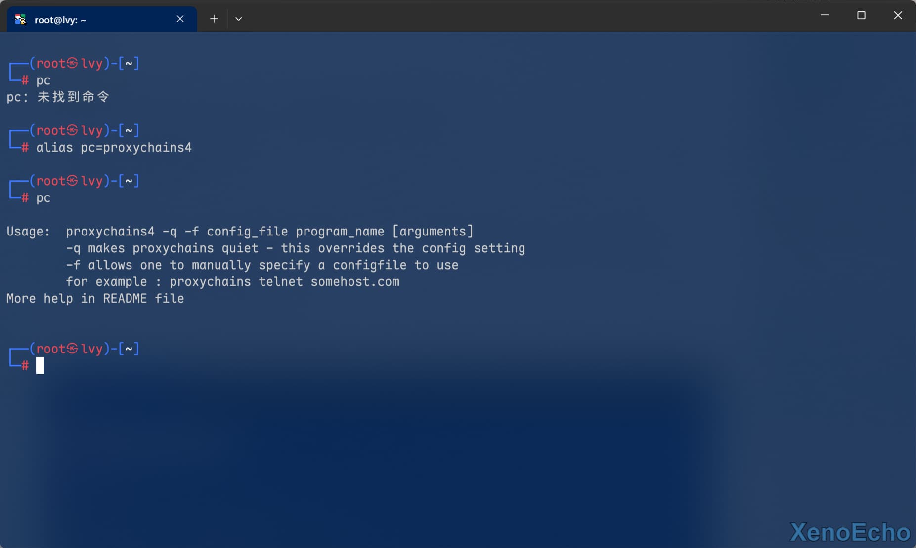 正常使用的时候需要在需要代理的程序前面加上proxychains4,命令稍微有点长,这时候可以通过alias来为它设置别名。